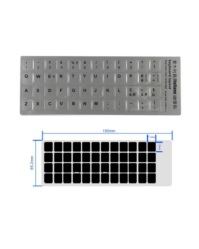 Il kit stickers layout italiano comprende tutte le lettere, i numeri e i caratteri speciali più importanti. Non comprende i tasti F1, F2 ecc ecc e tutti quei caratteri esterni alle lettere come TAB, BLOCK, MAISCOLO,